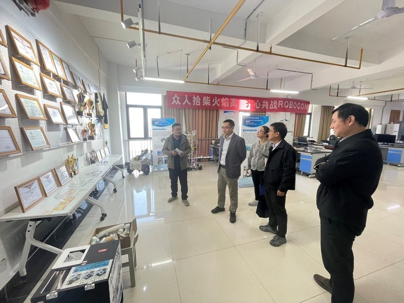 會(huì)后,調(diào)研組一行參觀了工業(yè)機(jī)器人、智能制造系統(tǒng)、相關(guān)競(jìng)賽基地等專業(yè)實(shí)驗(yàn)實(shí)踐平臺(tái),了解了設(shè)備配置情況與學(xué)生競(jìng)賽的管理與運(yùn)行機(jī)制。實(shí)驗(yàn)室負(fù)責(zé)人現(xiàn)場(chǎng)講解了多個(gè)代表性學(xué)生競(jìng)賽項(xiàng)目,具體展示了理論教學(xué)向工程實(shí)踐轉(zhuǎn)化的路徑與方法。