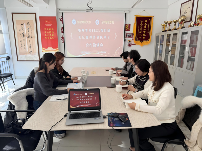 雙方圍繞項目內(nèi)容展開了務(wù)實討論:山東管理學(xué)院師生分享了銀發(fā)時間銀行理念、“商超+高校”運營模式、養(yǎng)老積分互換機制及引進企業(yè)資源的經(jīng)驗;我院項目團隊系統(tǒng)介紹了“銀呼青應(yīng)”平臺的設(shè)計理念與服務(wù)模式,重點展示了基于智能手環(huán)與響應(yīng)平臺構(gòu)建的資源整合方案及MVP推進計劃。通過此次交流,雙方初步達成合作意向,未來將在學(xué)科競賽協(xié)同、功能模塊互補與跨區(qū)域資源共享等方面探索持續(xù)協(xié)作機制。